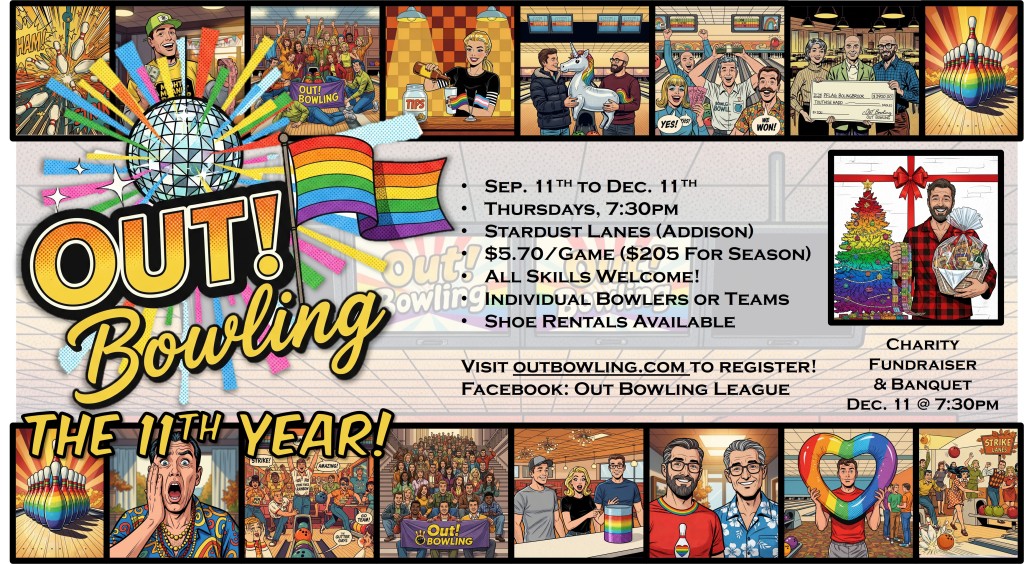 That’s not a typo. That has been our league’s motto since its founding in 2014. Since that time, Out! Bowling has seen more than a dozen seasons of friends, family, and love for the LGBTQ+ community and their allies. We are the preeminent queer bowling league in the Chicago suburbs with a community of over 500 people. If you’re looking for a pressure-free night out with your friends where you can be, well, YOU! – then Out! Bowling is for you! Learn all about our story by clicking here. And if you’re interested in joining us for an upcoming season, details are below.